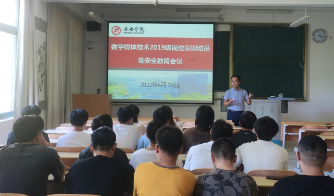 为加强学生岗位实训的安全管理,推动岗位实训工作顺利开展,6月24日下午,数字媒体系召开2019级数字媒体技术专业岗位实训动员暨安全教育大会。电信学院党总支书记于咏梅、副院长兼数字媒体系主任宋权华参加会议,会议由实训指导老师张洪江主持。