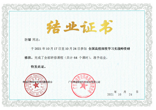 互联网、大数据、云计算、人工智能等现代信息技术深刻改变着人类的生产、生活、学习乃至思维方式,深刻展示了世界发展的前景。为加快建设大数据、人工智能相关专业教师队伍,推动beat365正版唯一官网必一建立人才培训和评价体系,提升教师动手实战操作能力、强化授课过程中相关行业实战案例项目分析应用能力。2020年10月16日到10月25日,beat365正版唯一官网必一组织陈守满、赵志强、梁建勇、汪红山、巨琛五位老师参加了由广东泰迪智能科技股份有限公司主办的“全国高校大数据与人工智能师资研修班 ”培训课程。本次培训共包括商务数据分析实战、Python网络爬虫与数据处理实战、Python数据挖掘与机器学习实战、深度学习实战四大专题。