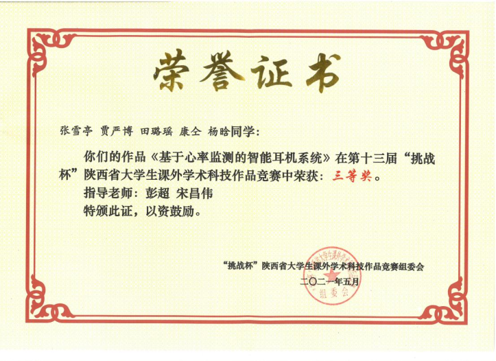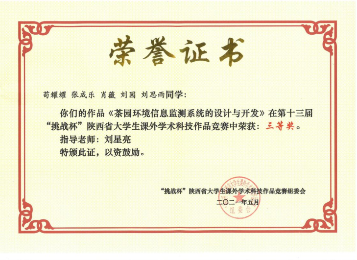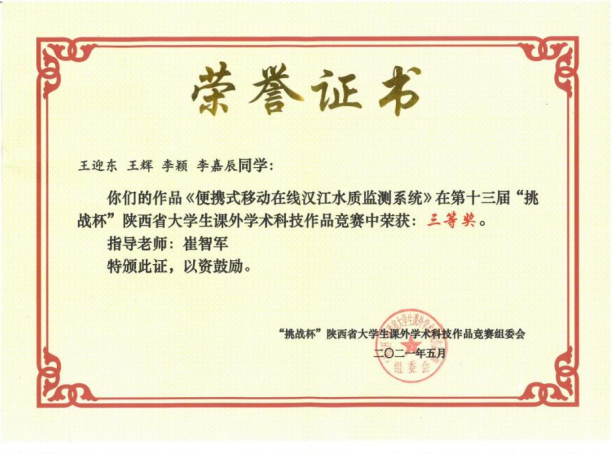 近日,由共青团陕西省委、陕西省委教育工委、陕西省科协、陕西省社会科学院、陕西省学联共同主办,陕西师范大学承办的第十三届“挑战杯”陕西省大学生课外学术科技作品竞赛落下帷幕。我院崔智军、刘星亮、宋昌伟老师指导学生完成的《便携式移动在线汉江水质监测系统》、《茶园环境信息监测系统的设计与开发》、《基于心率监测的智能耳机系统》三个项目获得省级三等奖。