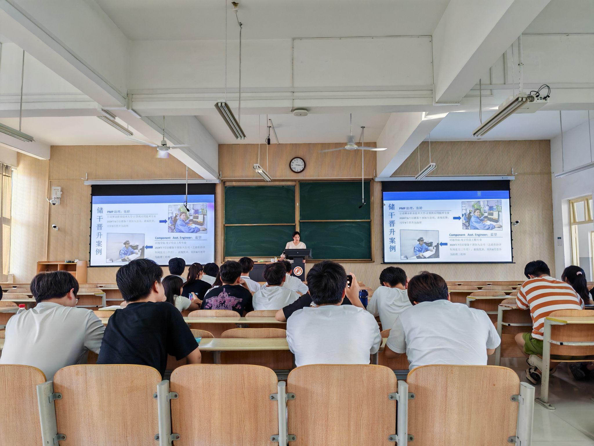 两家企业代表分别介绍了企业的发展历程、企业文化、专业技术优势以及未来的发展前景等情况,让学生们对企业的实力与规模有了更深入的了解。同时,企业代表还分享了实习规划、岗位要求等实习生培养和就业机会方面的信息,为学生们提供了更多的选择和机会,让大家了解行业发展情况与岗位要求并鼓励他们积极参与公司的实习,着实提升自身的职业竞争力。