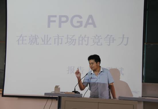 报告会上,李凡高级工程师以80年代硅谷的崛起为切入点,从电子管、晶体管、集成电路、专用集成电路(ASIC)到现场可编程逻辑阵列(FPGA)。介绍了FPGA产生的背景、技术现状、产业链等情况;以智慧地球为例,诙谐生动地阐述了FPGA在通信领域、嵌入式应用、可重构计算等方面的应用与未来发展趋势;以李约瑟难题“为什么进入现代,中国人却远离了发明”和“为什么近代科学没有产生在中国”提出电子硬件设计技术的发展不仅需要改革理念,还需要改革我们自身,以此来改革我们的民族,改革我们的世界。李凡高级工程师指出,FPGA技术正处于蓬勃发展时期,是一个朝阳产业,鼓励师生要树立信心,只有下功夫才能掌握这门技术;李凡高级工程师以屈原的名句“路漫漫其修远兮,吾将上下而求索”与电信系师生共勉。至芯科技公司雷斌总经理为即将毕业的学生分析了FPGA行业的人才需求和就业前景,同时也与参加会议的教师和学生就相关问题进行了深入讨论。
