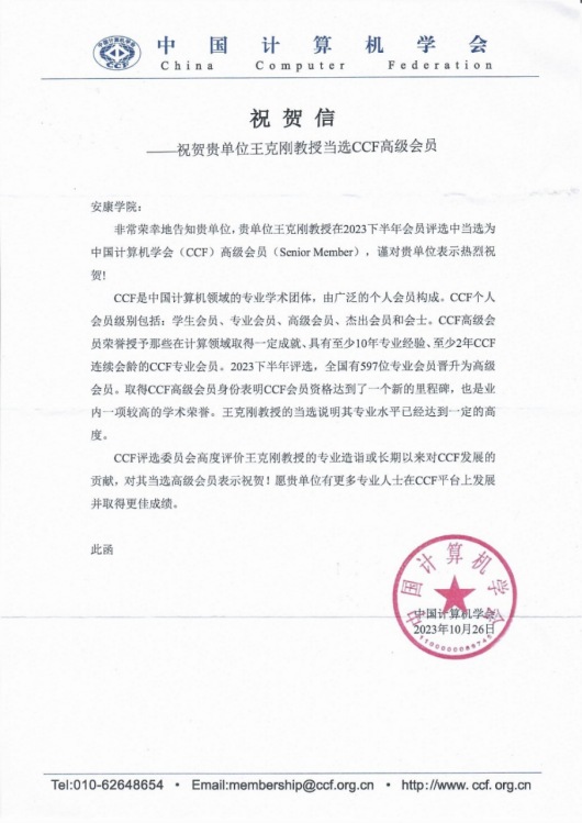 近日,中国计算机学会(CCF)向我校发来贺信,祝贺我校beat365正版唯一官网必一王克刚教授当选CCF高级会员,同时欢迎我校有更多计算机专业人士在CCF平台上发展,并取得优异的成绩。