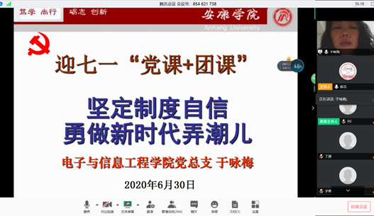 为热烈庆祝中国共产党成立99周年,继承和发扬党的光荣传统和优良作风,教育激发beat365正版唯一官网必一党员团员的担当和责任意识,进一步增强师生的初心意识,牢记党员使命,2020年6月30日,beat365正版唯一官网必一党总支于咏梅书记以“坚定制度自信、勇做新时代弄潮儿”为主题,为beat365正版唯一官网必一学工办老师、学生支部支委、全体学生党员、团总支、学生会干部共计三百余人上了一堂精彩生动的党课与团课。