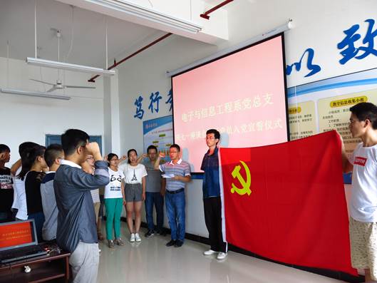 2015年7月1日早上10点, 电子与信息工程系党总支在逸夫科技楼B702教室隆重举行了庆七一座谈会暨新党员入党宣誓大会。系党总支书记李红兵老师、组织委员王克刚老师以及13位新党员同志共同参加了本次会议。会议由学生支部书记成英丽老师主持。