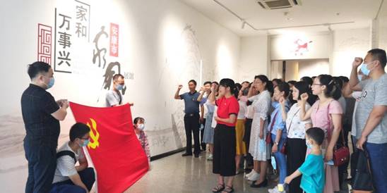 本次主题党日活动分为三个环节:全体党员重温入党誓词、讲解员解说、教职工自主参观。首先,全体党员举行了“重温入党誓词”活动。在鲜红的党旗下,在教工第三支部书记余顺园同志的带领下,全体党员同志庄严地举起右手,握拳宣誓,重温入党誓词。