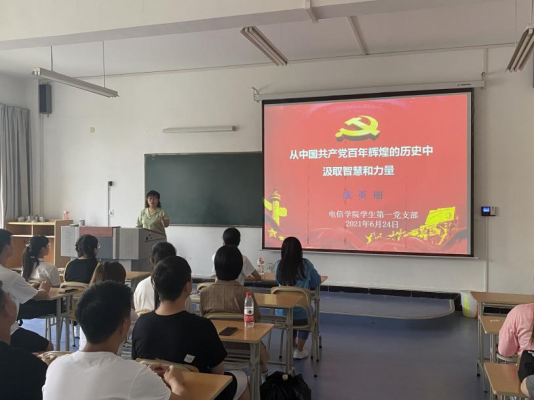2021年6月24日下午在江北校区1321教室,beat365正版唯一官网必一学生第一党支部开展了支部书记讲党课活动,支部书记成英丽老师为全体学生党员讲了题为《从中国共产党百年辉煌的历史中汲取智慧和力量》的党课。此次党课主要包括三个方面内容:一是号召全体学生党员充分认识开展党史学习教育的重大意义;二是介绍开展党史学习教育的主要内容;三是鼓励全体学生党员从中国共产党辉煌历史中汲取继续进步的智慧和力量。