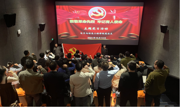 首先,由全体师生党员重温入党誓词。“我志愿加入中国共产党,拥护党的纲领,遵守党的章程,履行党员义务……”,影院内传来了庄严洪亮的声音,在党总支书记于咏梅的带领下,党员们高举右拳,面向鲜红的党旗,重温入党誓词。党员们庄严宣誓,用铮铮誓言彰显永恒初心,牢记党员意识,永葆党员本色。