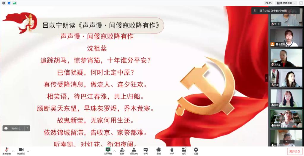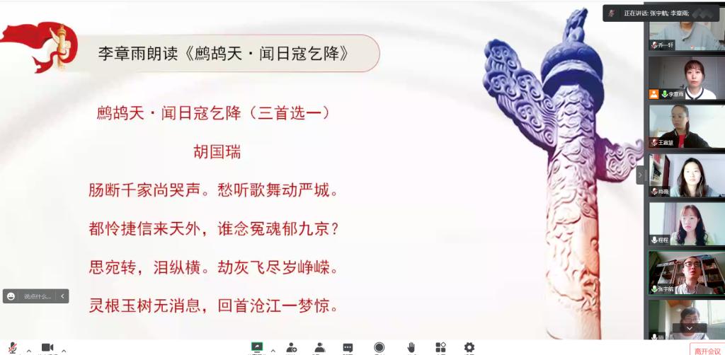 会前,全体与会师生为中国人民抗日战争中牺牲的英雄烈士默哀一分钟。活动在全体奏唱《中华人民共和国国歌》中拉开序幕。教师代表成英丽朗读《日寇乞降喜而不寐枕上作》、石纭昊朗读《闻日本乞降感赋》、程晓梅朗读《闻胜有感·惊讯》、李章雨朗读《鹧鸪天·闻日寇乞降(三首选一)》、吕以宁朗读《声声慢·闻倭寇败降有作》;学生代表2019级电子商务1班于昊朗读《闻日寇投降》、2019级数字媒体技术1班许梦朗读《盟军胜利日本投降二首》、2019级计算机科学与技术3班魏海源朗读《水调歌头·彭雪枫》、2019级电子信息工程1班程果朗读《太行春感》、2019级计算机科学与技术1班赵梦朗读《沁园春·赵一曼》。在声声诵读著名抗日民族英雄的爱国诗篇中,各位党员、团员深刻感受中华民族万众一心、众志成城的强大凝聚力,感受“天行健,君子以自强不息”的民族精神,以及那流淌在心间的英雄情结,家国情怀。