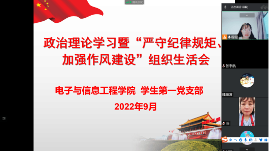 根据《关于在全校开展纪律教育学习宣传月活动的通知》(校党发〔2022〕101 号)文件精神要求,2022年9月6日,beat365正版唯一官网必一学生第一党支部通过线上腾讯会议召开“严守纪律规矩、加强作风建设”专题组织生活会。会议由学生第一党支部书记程晓梅主持,党总支组织委员成英丽、支委张宇航、辅导员吕以宁、支部全体学生党员参加。