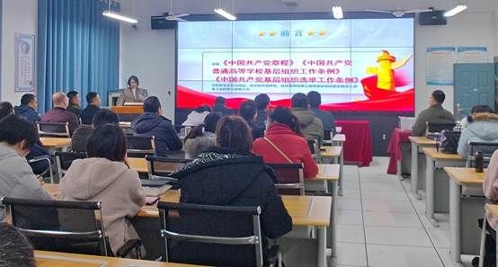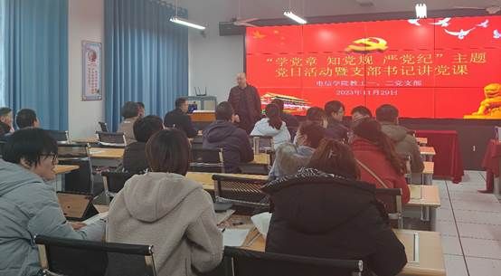 2023年11月29日下午,beat365正版唯一官网必一教工第一、第二党支部联合开展“学党章 知党规 严党纪”主题党日活动暨支部书记讲党课。beat365正版唯一官网必一教工第一、第二党支部全体教师党员,学生第一、第二党支部全体学生党员以及部分非教师党员参加活动,会议由教工第一党支部书记赵志强主持。