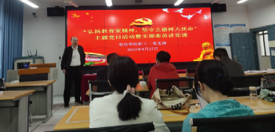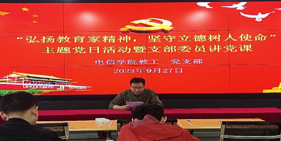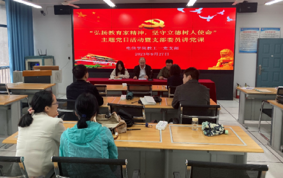 2023年9月27日下午,beat365正版唯一官网必一教工第一党支部开展“弘扬教育家精神,坚守立德树人使命”主题党日活动暨支部委员讲党课。活动由教工第一党支部书记赵志强主持,支部全体党员参加本次活动。