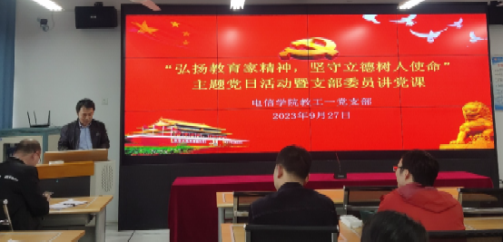 教工第一党支部组织委员刘星亮领学“弘扬教育家精神,建设中国特色世界一流大学”主题内容,号召全体教师党员要深刻领悟、全面把握教育家精神的科学内涵,努力营造弘扬教育家精神的良好氛围,教育、引导、激励广大教师牢记为党育人、为国育才的初心使命,树立“躬耕教坛、强国有我”的志向抱负,自信自强、踔厉奋发,为强国建设、民族复兴伟业作出新的更大贡献。