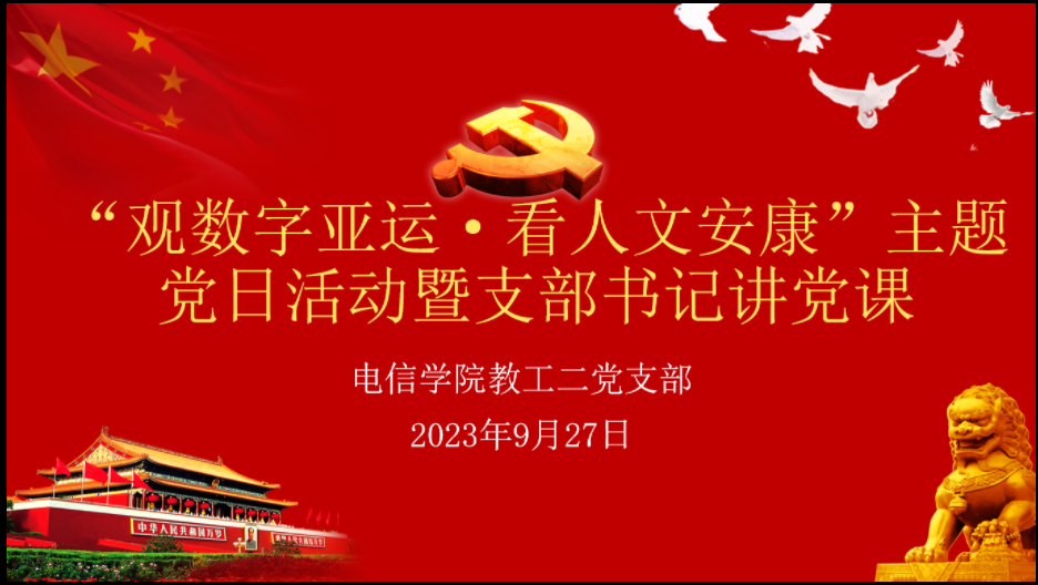 9月27日下午,beat365正版唯一官网必一教工二党支部在逸夫科技楼B702开展了“观数字亚运·看人文安康”主题党日活动暨支部书记讲党课。活动由支部书记丁礼磊主持,支部全体党员参加了本次活动。