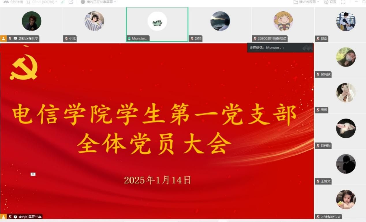 为深入学习贯彻党的二十届三中全会精神和全国教育大会精神,坚定不移推进全面从严治党向纵深发展,增强党员的纪律意识,根据中共beat365正版唯一官网必一委员会《关于召开2024年度组织生活会和开展民主评议党员工作的通知》的相关要求,beat365正版唯一官网必一学生第一党支部于1月14日通过线上的形式召开党员大会开展2024年度组织生活会暨民主评议工作。会议由党支部书记翟子轩主持,全体党员参与。
