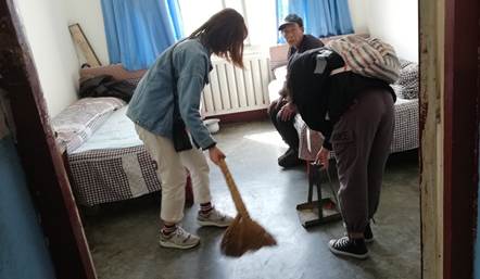 到达敬老院后,副书记史冬根据现场情况将志愿者分为三组,第一组负责清理厨房,第二组清扫院子布置场地,第三组帮助老人打扫寝室的卫生。