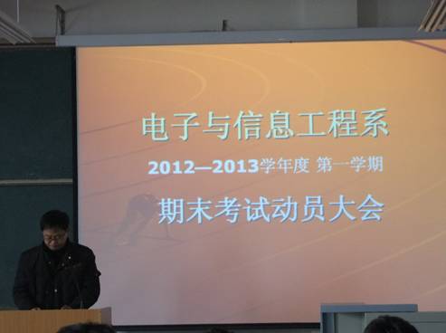 2013年1月17日下午,电子与信息工程系在1号楼301教室举行了考前动员大会,系党总支书记李红兵、系副主任陈守满、学办副主任石纭昊,2012级新生参加会议。会议由系党总支书记李红兵主持。