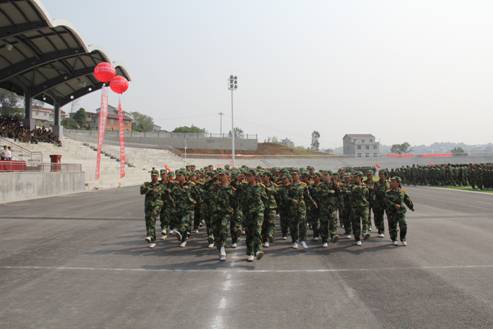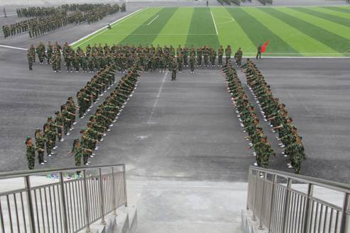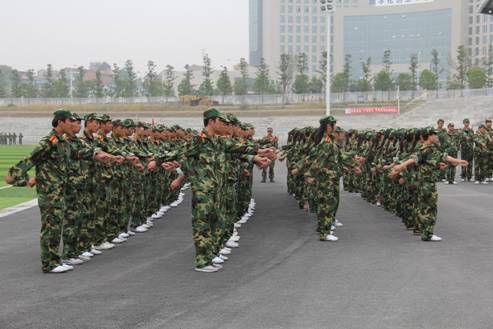 运动场上,2013级的新生们个个穿着整齐的军服,正在骄阳下稍息、立正、站军姿、走正步。烈日炎炎,同学们汗流浃背,但仍然坚持训练下去。在她们心中有一个坚定的信念,那就是坚持,坚持,再坚持。同学们清楚的知道军训是大学生活中的第一课,是他们锻炼体魄、增强体质、磨练意志、加强集体荣誉感、培养良好行为习惯的宝贵经历,是把自己融入到新集体的一次难得的机会。因此在此次军训中他们都倍感珍惜。与此同时,他们也懂得了许多国防知识,培养了团队精神,增强了国防意识。
