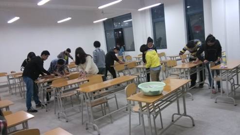 2012年4月3日,电子与信息工程系开展“感恩学校——清洁教室桌椅”活动 。近来出现一些教室的桌椅被乱涂乱画的现象,为了帮助大家意识到乱涂乱画现象的不正确,提高大家爱护学校桌子的公共财产的意识,电信系对1号教学楼3层全部教室的桌椅进行清洗,提示大家时刻爱护公共设施。