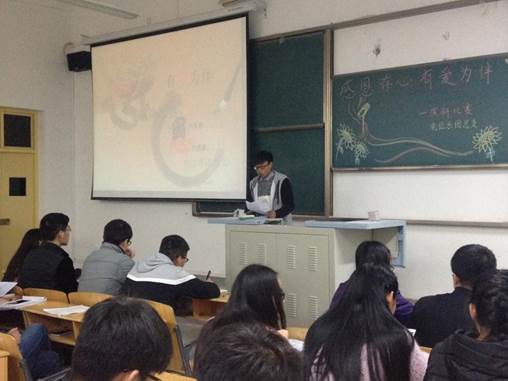 11月26日下午7点半,电信系“感恩存心,有爱相伴”演讲比赛在1423室举行。本次比赛以“感恩”为主题,旨在引导大学生充分理解感恩的意义,学会感恩。本次比赛共有32名参赛选手。