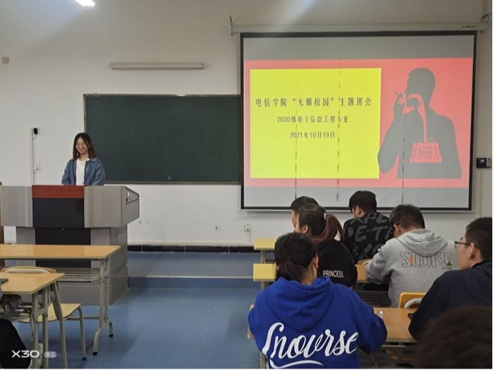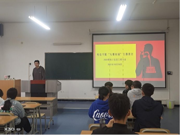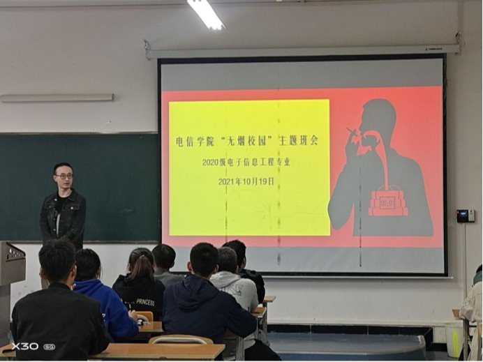 为进一步提升学生禁烟意识,扎实推进学院禁烟工作,创建无烟校园,10月19日,beat365正版唯一官网必一2020级电子信息工程专业在江北校区1321教室开展了“无烟校园”主题班会活动。辅导员张宇航参与班会,会议由班长张卓涛主持。