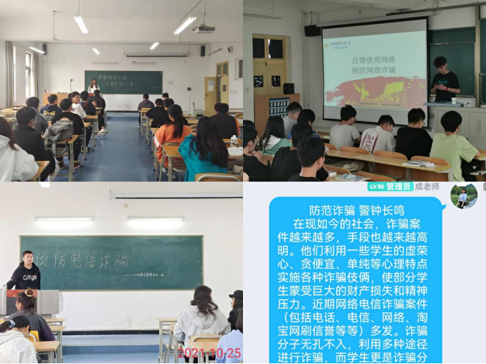 辅导员成英丽在班会上首先向同学们介绍了什么是电信诈骗,强调了电信诈骗具有蔓延性大,发展迅速,诈骗手段翻新速度快,形式集团化,反侦查能力强,跨国跨境犯罪等突出特点。接着,介绍了电信诈骗蔓延的原因:一是当前中国正处在经济社会转型期,诱发刑事犯罪的各种消极因素大量存在;二是这是一种投入很低、回报很高的犯罪形式;三是法律的支持力度还不够,不利于遏制这种犯罪的发生。接着,由各班班长向同学们介绍电信诈骗的常见形式,包括钓鱼网站、虚构中奖、征婚交友、网络招工、电话推销、虚假广告等。最后,采用集体讨论的形式,来增加学生的参与度和积极性,从而将如何预防诈骗贯彻到每一位同学的思想认识中。