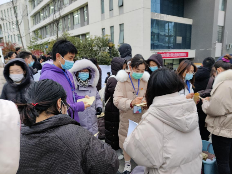 志愿服务活动中,beat365正版唯一官网必一党总支首先为全体在校考生精心准备、免费发放了一份爱心午餐,并将志愿者和考生做了一对一帮扶安排,要求志愿者和考生保持联系、随时提供帮助。12月25日、26日考试的两天中,寒风凛冽,天空中飘着雪花,在考生进考场一小时前,志愿者在一号教学楼楼梯口前,协助完成了考生的核酸检测工作。在考试期间,志愿者们集中保管了考研学生的私人物品,并且随时待命,保持手机畅通,接受由于疫情影响所引起的各类突发性工作。遇上院外或校外考生咨询信息时,志愿者给予了热情的回复帮助。