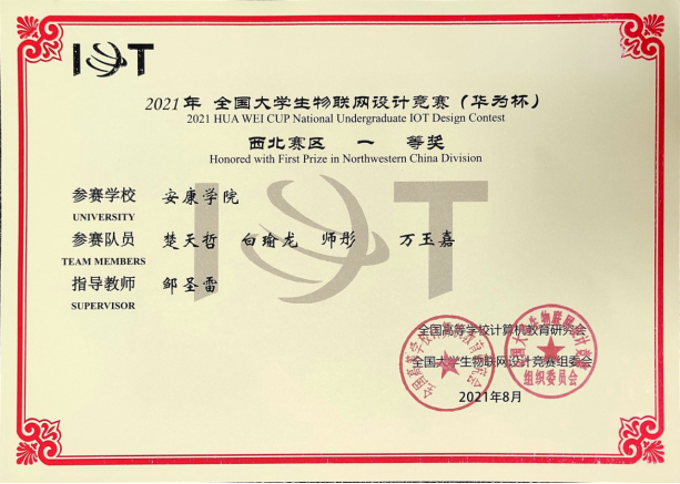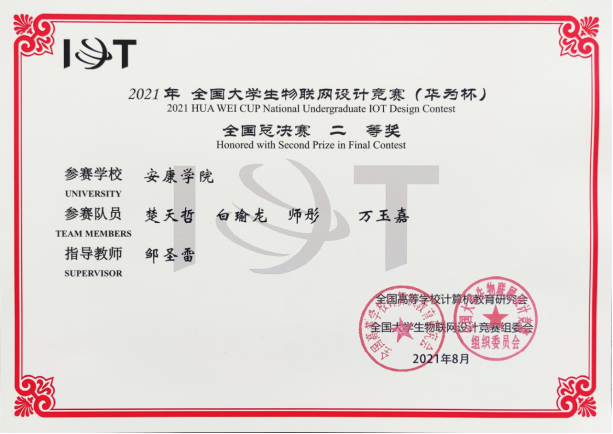 近日,2021年全国大学生物联网设计竞赛(华为杯)全国总决赛在上海紫竹科学园隆重举行。beat365正版唯一官网必一邹圣雷老师指导的学生团队(楚天哲、白瑜龙、师彤、万玉嘉)表现出色,在西北赛区获一等奖入围全国总决赛,最终荣获全国二等奖。