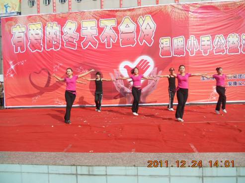 2011年12月24日,安康市义工联合会、安康市共青团汉滨区委承办的“有爱的冬天不会冷,温暖小手公益活动”在白天鹅广场举行。电信系志愿者服务队作为市义工联合会的长期合作单位受邀参加活动,表演了精心编排的节目。电信系多年来一直致力于社会公益活动,希望通过努力,让需要帮助的人群感受到社会的关爱;通过奉献,让这个寒冷的冬天充满温暖。