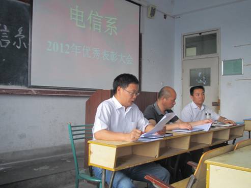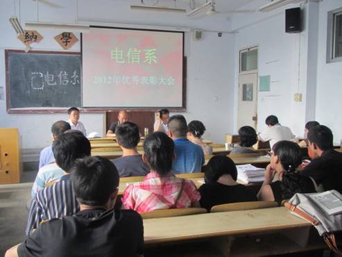 6月28日下午,电信系在1219召开2011-2012学年度表彰及教学工作安排大会。大会对系内的优秀教案、优秀党员、优秀教师、考研先进集体进行了表彰。电信系全体教职工参加了大会。大会由系党总支书记李红兵主持。