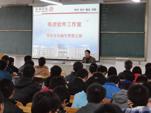 11月7日下午,电信系在江北校区1301教室举行了由陈虎教授主讲的题为“带你走向编写梦想之路”学术报告会,并召开了陈虎软件工作室招收学员动员会。电信系教学副主任陈守满教授、计算机应用教研室老师和12级计算机专业266名学生参加了大会。大会由陈守满教授主持。
