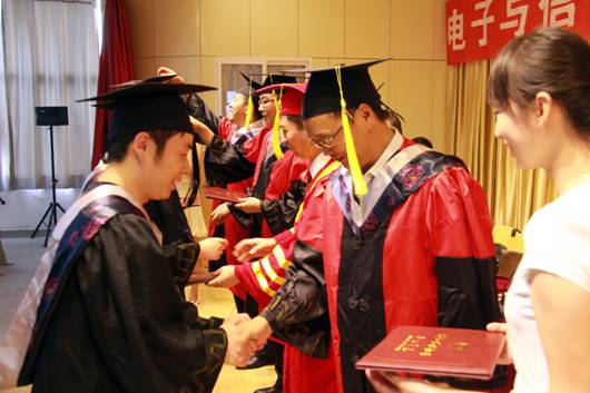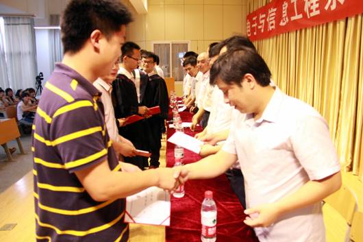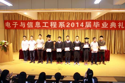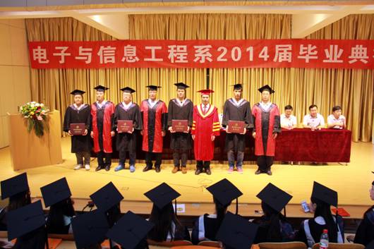 典礼在雄壮的国歌中拉开了序幕。张东红主任致毕业贺词,张主任向学业有成、即将告别母校、踏上新的人生征途的毕业生表示最热烈的祝贺!同时,他向毕业生提出了三点希望:一是希望毕业生们尽快适应新工作、新环境;二是希望同学们把毕业看做新的起点,继续学习,增强能力;三是希望每位即将踏出校门的学子牢记母校的培养之恩,铭记老师的教导之情,为社会多做贡献,成为母校的骄傲,学院的自豪。系副主任陈守满宣读了校级优秀毕业生名单,并颁发了证书。王克刚老师代表全系教师向圆满完成学业的同学们表示衷心的祝贺,并向毕业生提出了三点期望:一是坚持理论研究,将理论与自己的教育实践相结合,无论走到哪里,都不要忘记对知识的渴求,用知识开拓未来;二是历练过硬的本领,走进社会,步入工作岗位,过硬的本领是成功的保障;三是坚持高尚品德,加强思想修养,公民的道德是必须坚持的。电子信息工程学生王洋代表全体学生表达了对学校和老师的感激与不舍,表示将牢记我系“笃行务实、学以致用”的系训,在今后的工作中,努力做到理论与实践相结合,敢于创新,勇于突破,把电信系精神发扬光大,并祝电信系越办越好,再创佳绩。