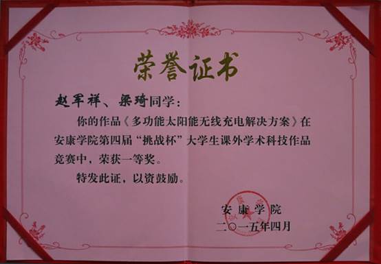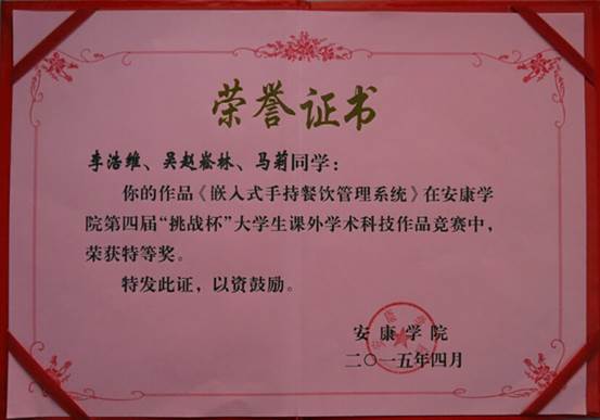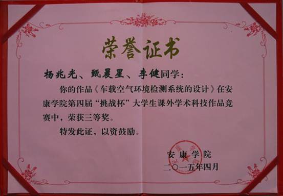 2015年3月26日,第四届beat365正版唯一官网必一“挑战杯”大学生课外学术科技作品竞赛在安康学校10号教学楼隆重举行。经过紧张激烈的角逐,电信系电子信息工程专业2012级学生完成的作品在校内决赛中分别荣获特等奖一名,一等奖一名,三等奖一名。三个作品的指导老师邹圣雷老师荣获“优秀指导老师”的荣誉称号。