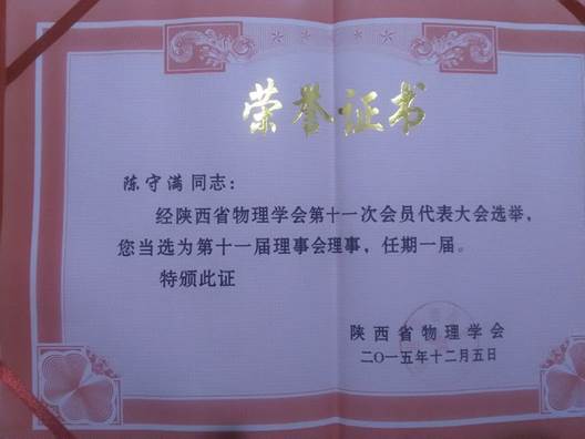 陕西省物理学会2015年学术年会于2015年12月5日在西北工业大学长安校区举行。本届学术年会由陕西省物理学会主办,西北工业大学承办,高等教育出版社及7家科技公司协办。大会主席为侯洵院士,大会执行主席为白晋涛、陈光德教授,大会副主席为田东平、李福利、赵建林、郭立新、屈世显教授。我院选派2名教师参加了本届年会。