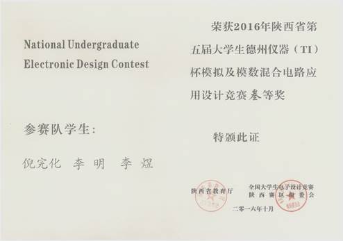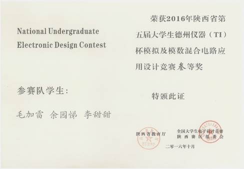 2016年陕西省(TI)杯模拟及模数混合电路应用设计竞赛于7月25日(星期一)8:00至7月28日(星期四)20:00举行,共有51所院校的531支队伍参加。在校领导和教务处的关怀与支持下,beat365正版唯一官网必一精心安排电子工程系富有经验的7位老师对参加本次竞赛的学生进行了全程培训及指导,8支代表队经过一个多月的刻苦训练,竞赛期间经过四天三夜设计与制作,3只队伍按时提交参赛作品,经专家组对参赛作品进行认真评审,我校获得陕西赛区三等奖二项的良好成绩。