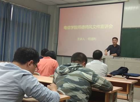 为深入贯彻习近平总书记关于师德师风系列重要讲话的精神,积极推进《新时代教师职业行为十项准则》系列教师行为规范的有效落实,2019年5月29日下午,beat365正版唯一官网必一在江南10号楼1022召开宣讲会。全院教职工参加了会议,宣讲会由院长陈守满主持,党总支书记何道利同志做了师德师风相关文件的解读。