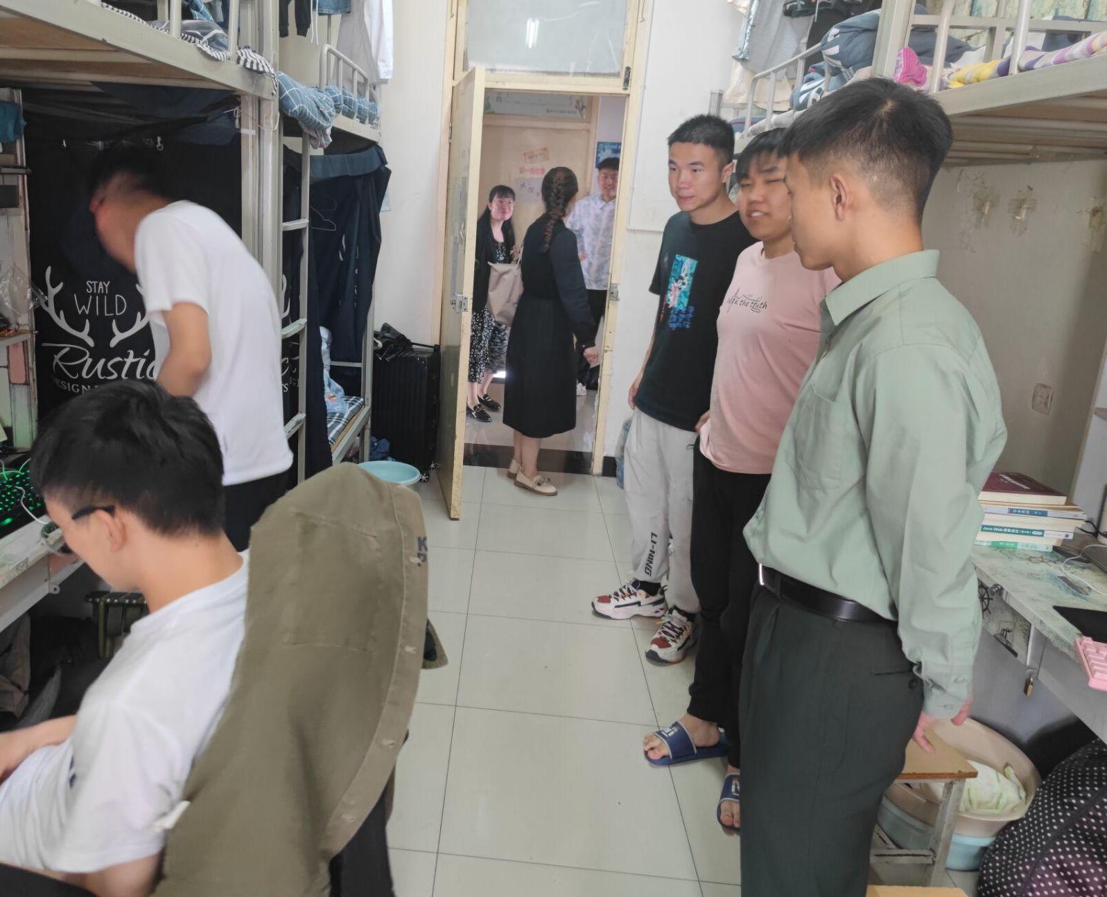 首先,辅导员们与退役大学生士兵检查6203、9303、9525、9621宿舍。张涛、刘成、王青波对宿舍的卫生、整洁情况等给予了整体评价,提出了物品摆放要求以及床铺整理标准:个人物品要摆放统一、整齐,寝室卫生需打扫得干净、清爽,并亲自示范,边操作边讲解。从如何将被子对折尺寸、折叠手法、掏平压实、叠出棱角,到各种生活用品的摆放一一示范,例如桌面物品摆放要一致、鞋子朝向要一致、书籍摆放要一致等。接着,各宿舍学生在观摩后,对各自的床铺、桌子、宿舍的公共领域进行了清扫、整理。