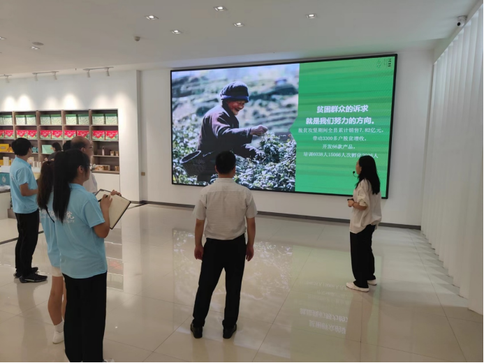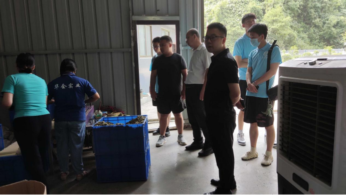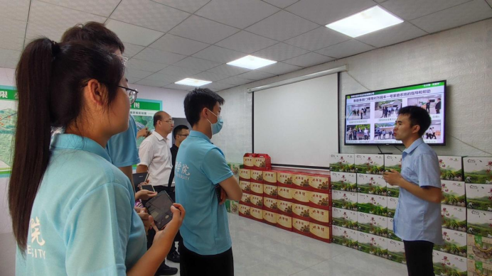 最后一站,来到了陕西万园丰农业开发有限公司、紫阳县丰禾种植养殖家庭农场。回乡创业大学毕业生、公司总经理陈华友热情接待了我们。陈总出于对土地的热爱以及回馈故乡的想法,他回到了自己的家乡发展农业。在发现每家每户的农产品销售途径单一、耗费大量人力的问题后,协助建立了紫阳县第一个电商服务站——毛坝镇电商服务站。并以此为基点向上建立紫阳县电商服务站,向下至各镇各村建立合作社从而形成一个总体的趋于完善的电商网络。各个网点之间信息共享、互通有无,打通了销售渠道。为打通农产品供销中梗阻,帮助解决销路和效益问题,紫阳县先后印发了支持经营主体收购贫困户农产品奖补办法、特色产业贷助力脱贫攻坚风险补偿金管理办法等一系列办法措施,鼓励通过大户带动、经营主体集中收购等形式,切实保障贫困户持续稳定增收。与此同时,县上还积极与京东、建行善融、国家扶贫网等大型知名电商平台合作,积极拓展茶叶等特色农产品销售新渠道。