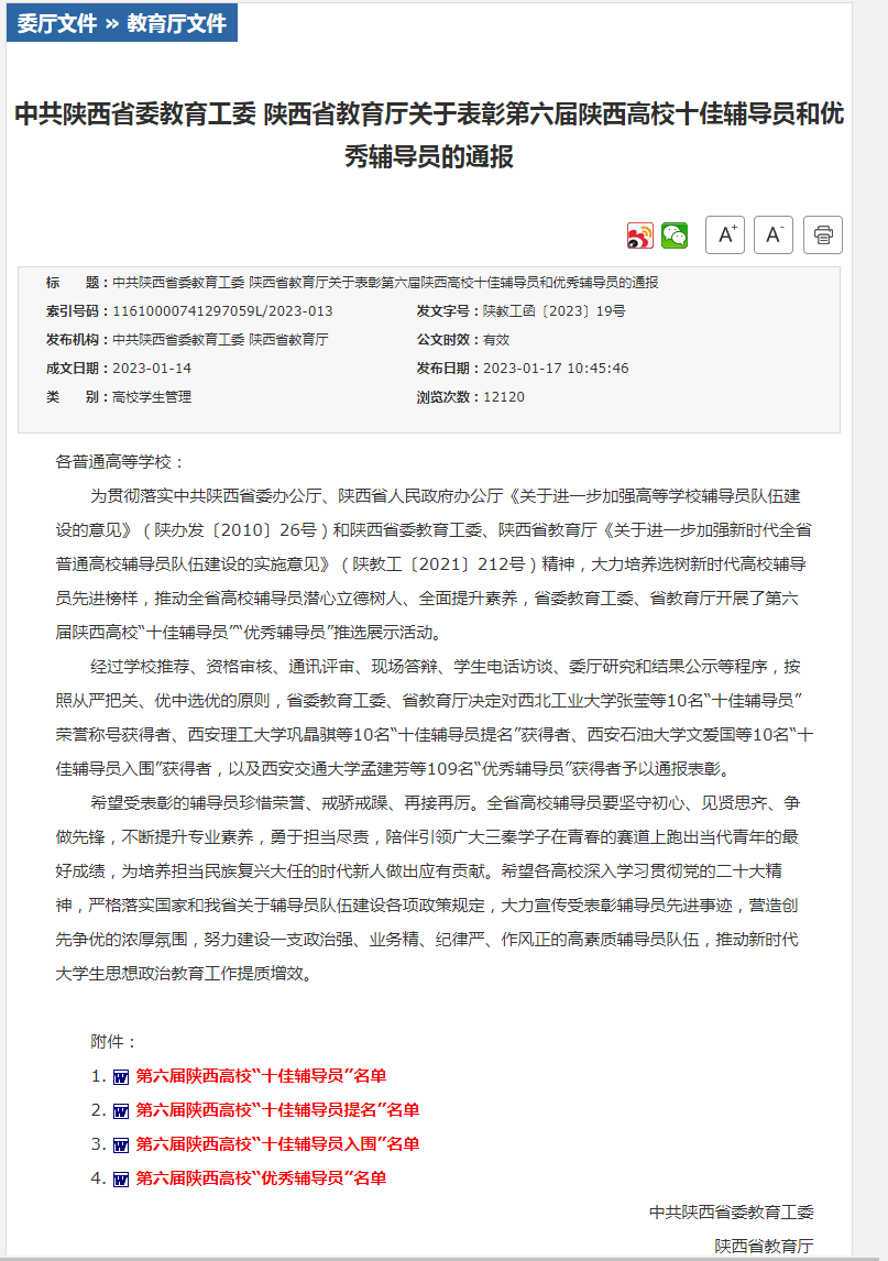 近日,中共陕西省委教育工委、陕西省教育厅发布《关于表彰第六届陕西高校十佳辅导员和优秀辅导员的通报》,beat365正版唯一官网必一辅导员成英丽获评陕西高校“优秀辅导员”荣誉称号。