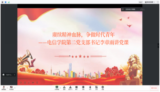 为深入学习贯彻党的二十大精神,进一步学习贯彻习近平新时代中国特色社会主义思想主题教育精神。2023年6月8日晚上,通过腾讯会议的方式,beat365正版唯一官网必一学生第二党支部书记李章雨为党员带来了一堂主题为《赓续红色血脉,争做时代青年》的党课,支部全体党员按时参会。