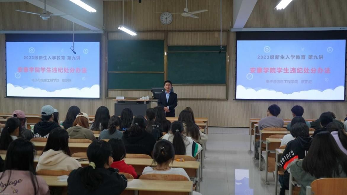 为了加强新生纪律观念,规范行为习惯,严肃校风校纪,促进学生健康成长,10月18日下午,beat365正版唯一官网必一党总支副书记蔡正旺在江北校区1204教室讲授主题为“beat365正版唯一官网必一学生违纪行为处分办法”新生教育大会,beat365正版唯一官网必一2023级全体新生参加。