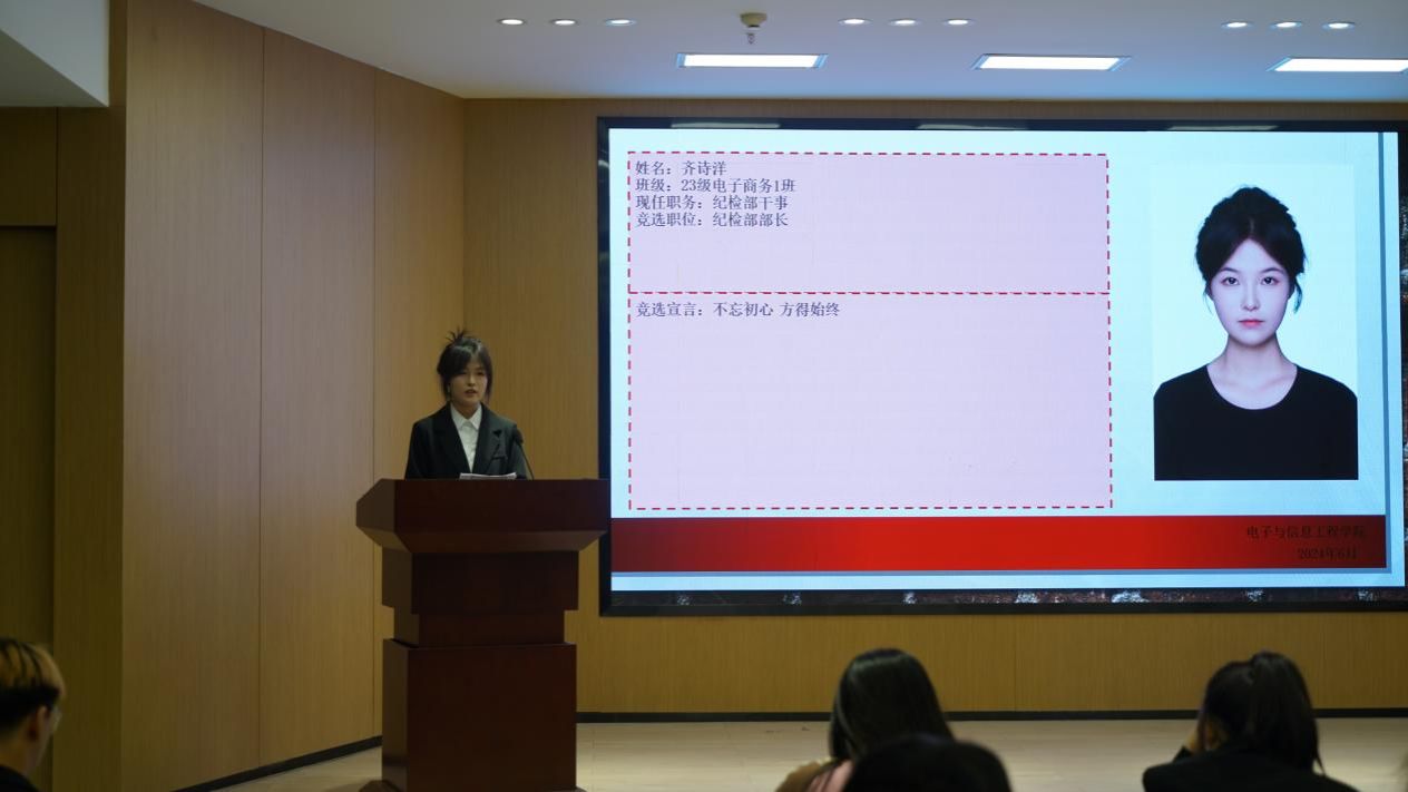 参与团总支、学生会、社团服务中心干部竞选的同学根据换届选举竞选要求,依次上台进行5分钟竞选演讲。竞选环节中,各候选人分别对自己已开展的工作进行了总结,谈到了自己在工作、组织中的收获、荣誉与成长,并阐述了自己未来工作的规划设想和展望。同时也表示在以后的工作中定会不忘初心,奋发向上,积极改革创新,为学院团学组织的发展贡献自己的一份力量。