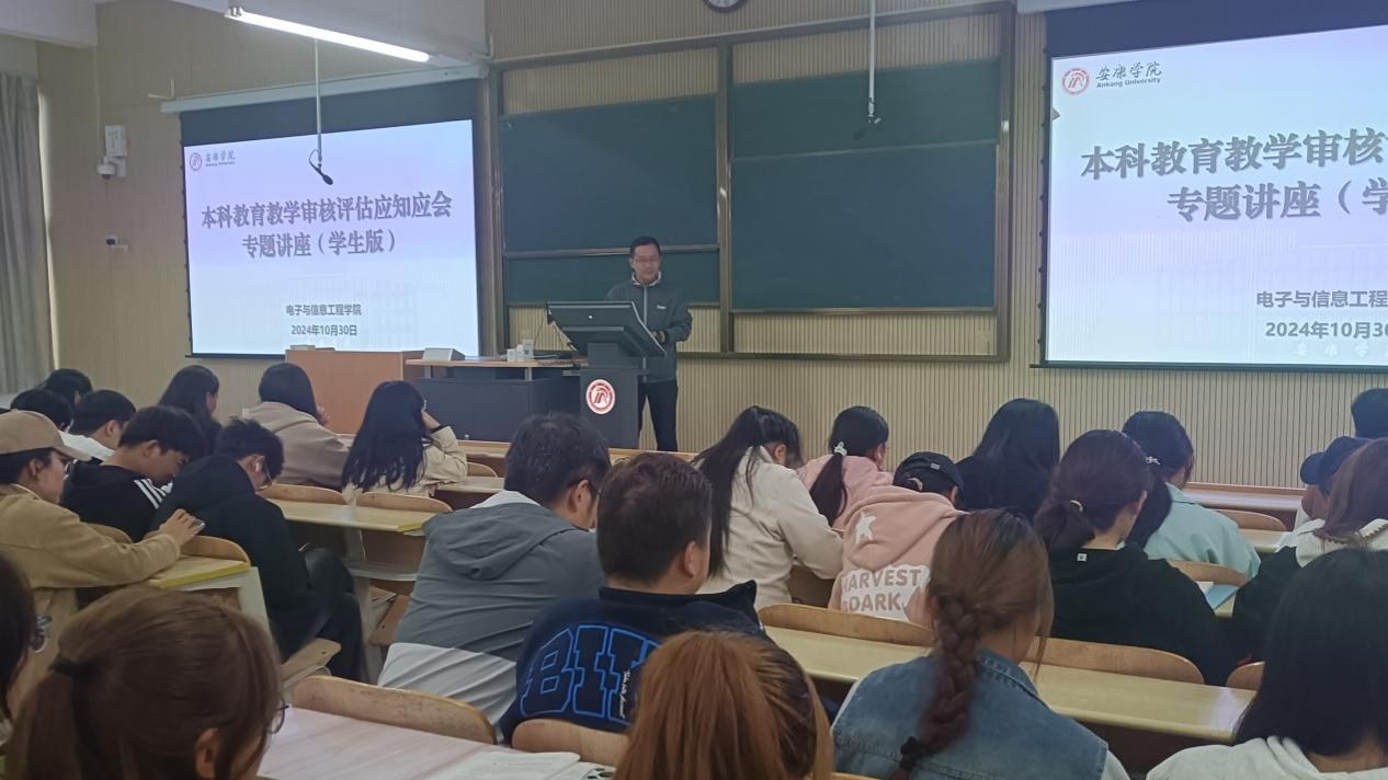 首先,宋权华副院长向同学们详细介绍了本科教育教学审核评估的重要意义、评估指标体系、学校的办学定位和特色等内容;介绍了我校的基本情况;对审核评估期间学风建设,提出了具体的要求。