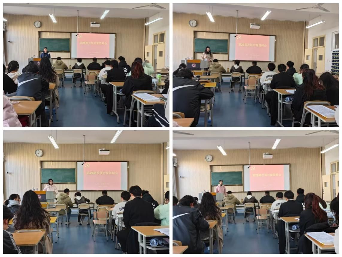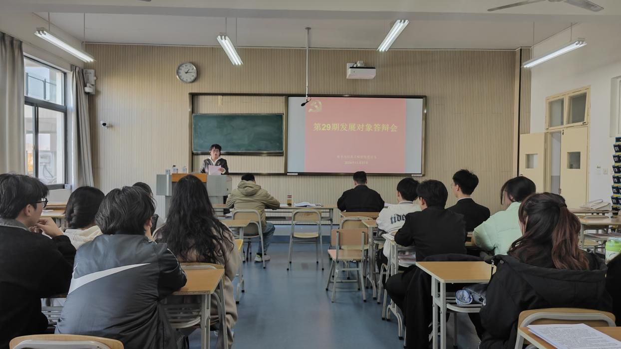 此次述职答辩旨在通过全面考察发展对象的政治素养、党性修养及综合素质,确保发展党员的高标准、严要求,切实把牢发展党员“入口关”。答辩采用现场抽签、答辩准备、自我介绍、老师提问、现场答辩等环节。在自我介绍环节,学生发展党员对象就个人基本情况、入党动机、个人思想发展变化过程、所获荣誉奖励等方面进行简要介绍。在老师提问环节,各位老师就关于党的性质、宗旨、指导思想、加入党组织条件、中国共产党党员条件、二十大、二十届三中全会精神、社会主义核心价值观等内容和学生如何提高角色意识、履行自身职责,正确处理好学习和工作的关系等方面展开提问,进一步考察了学生的思想政治素质、对党的认识、对党的基本理论知识和时事热点的掌握程度,考察了学生的工作能力和工作水平。