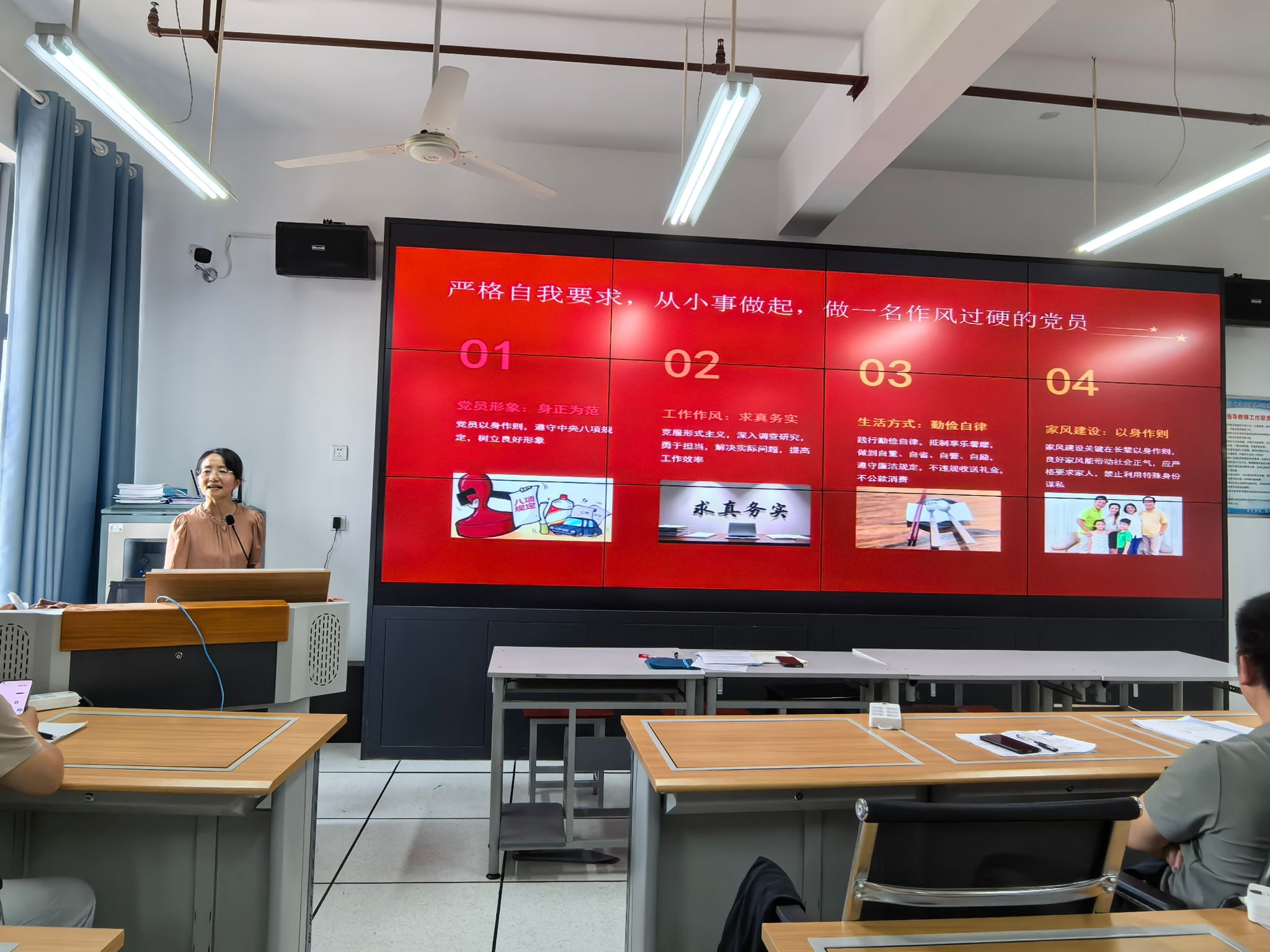 党总支书记田静以《严守中央八项规定精神 争做新时代合格党员》为题,讲授深入贯彻中央八项规定精神学习教育专题党课。田书记从“深刻认识开展深入贯彻中央八项规定精神学习教育的重大意义”“全面理解中央八项规定精神的核心要义”“践行中央八项规定精神,争做新时代合格党员”三个方面入手,对深入贯彻中央八项规定精神学习教育的重大意义、如何践行中央八项规定精神等进行系统阐释与深入解读。她指出,全体党员必须从思想上高度重视作风建设,在行动上严格落实中央八项规定要求。她要求党员教师要切实做到:强化思想认识,提高政治站位;规范日常行为,严守纪律底线;优化工作作风,力戒形式主义;树立良好形象,发挥模范作用。