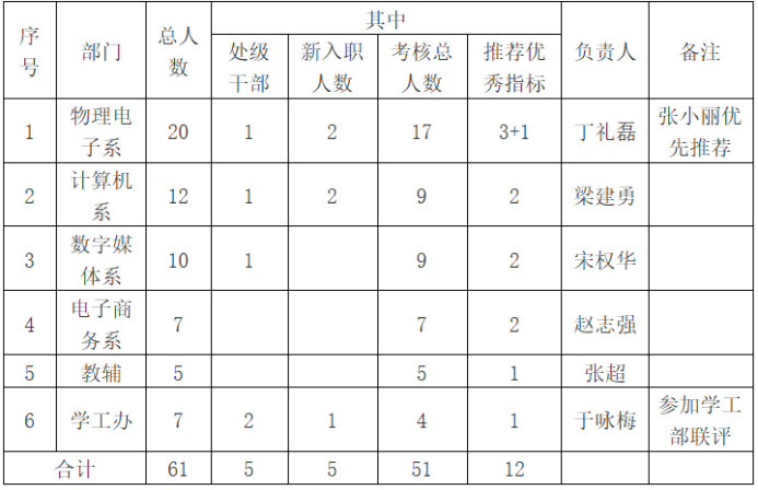 本年度学校下拨beat365正版唯一官网必一优秀指标7人,各部门推荐优秀指标报beat365正版唯一官网必一考核小组联评。推荐优秀指标分配与考核办法依据《beat365正版唯一官网必一教职工年度考核实施细则(试行)》(电院发〔2019〕05号),经beat365正版唯一官网必一党政联席会议决定,具体各系部年度考核优秀推荐指标分配和考核工作负责人名单如下: