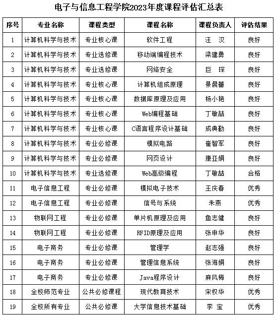 根据学校教务处下达的2023年度课程评估工作安排,学院召开了课程评估工作小组会议,按照专业人才培训方案、教学大纲等相关文件要求,对学院19门课程进行了评定。现将评定结果予以公示。