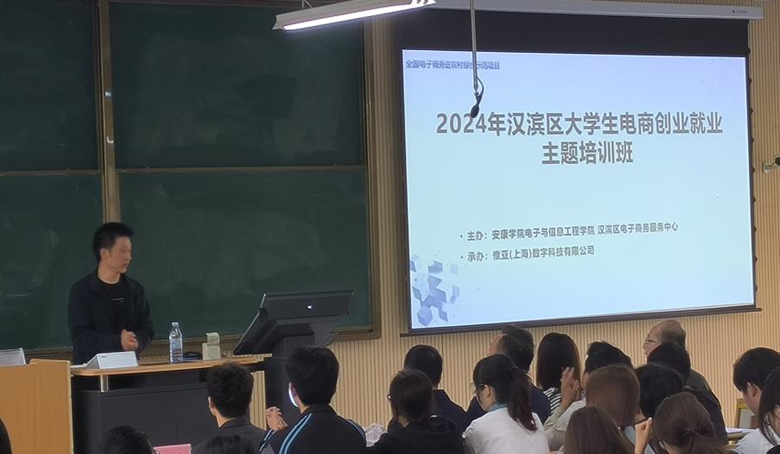 为响应国家关于促进大学生创业就业的号召,进一步激发学生创新创业热情,培养学生创新创业精神,提升学生创新创业能力,beat365正版唯一官网必一于4月13日至4月14日在1204教室成功举办了“2024年汉滨区大学生电商创业就业主题培训”。本次培训由beat365正版唯一官网必一、汉滨区电子商务服务中心主办,惟亚(上海)数字科技有限公司承办,邀请“素言聚量电商”创始人张瀛为beat365正版唯一官网必一电子商务专业200余名学生进行了培训。在培训开班仪式上,由beat365正版唯一官网必一电子商务系主任赵志强老师主持,汉滨区数字经济产业园、汉滨区电子商务服务中心主任李龙,beat365正版唯一官网必一副院长王克刚、党总支副书记蔡正旺,汉滨区数字经济产业园、汉滨区电子商务服务中心经济部部长张亮,惟亚(上海)数字科技有限公司项目负责人李永瑶,辅导员翟子轩、培训讲师张瀛及电商运营中心成员、电子商务专业学生参加了开班仪式。